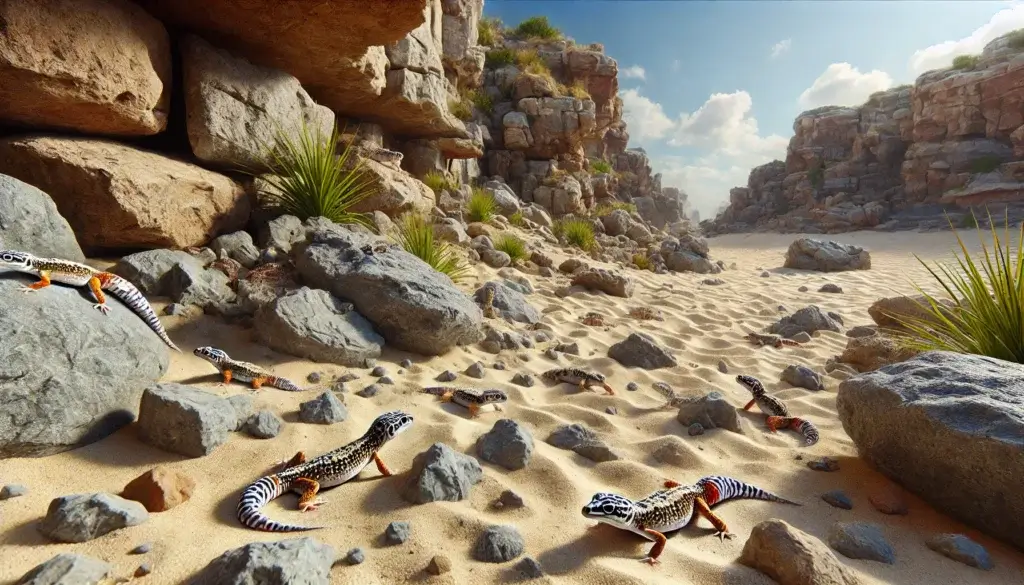 ヒョウモントカゲモドキ(レオパードゲッコー)は、主にアフガニスタン、パキスタン、インド北西部などの乾燥地帯に生息しています。これらの地域では、砂漠や草原の環境に適応して生活しています。ヒョウモントカゲモドキは夜行性で、昼間は岩陰や地中に隠れ、夜になると活動を始めます。